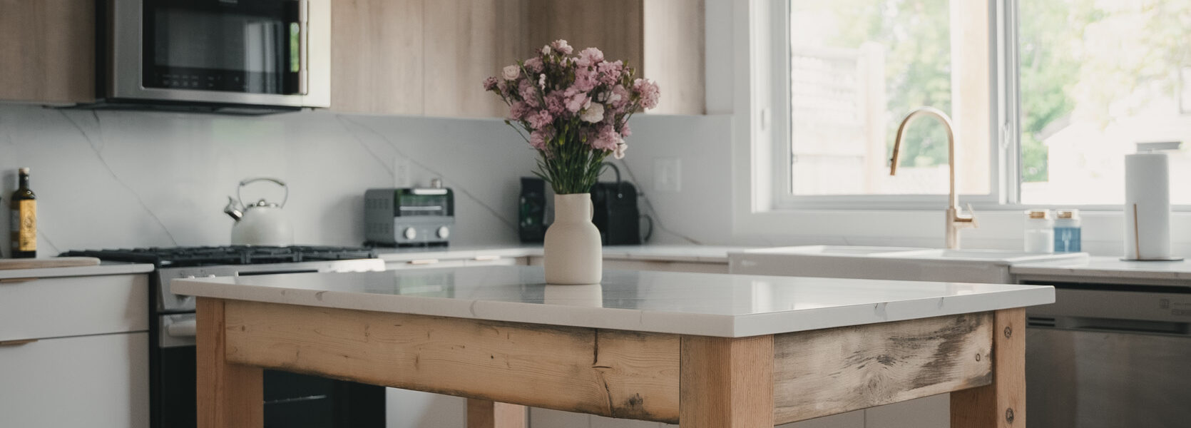 - Quartz countertops and backsplash
